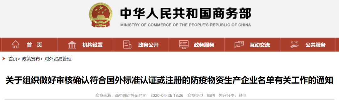为做好《商务部 海关总署 国家市场监督管理总局关于进一步加强防疫物资出口质量监管的公告》(2020年第12号)的落实工作,现就审核确认符合国外标准认证或注册的防疫物资生产企业名单有关工作通知如下: