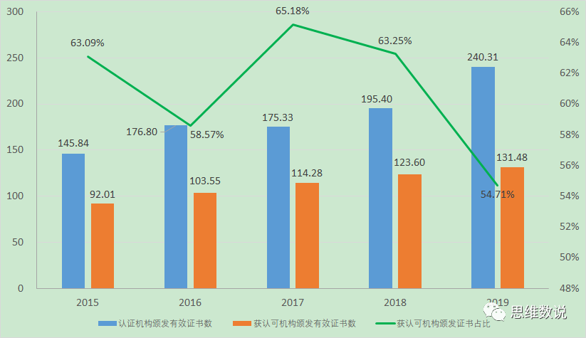 3.获得认可的认证机构颁发的有效证书占比从2015年底的63.09%下降至2019年底的54.71%,年均增长率为-2.81%。