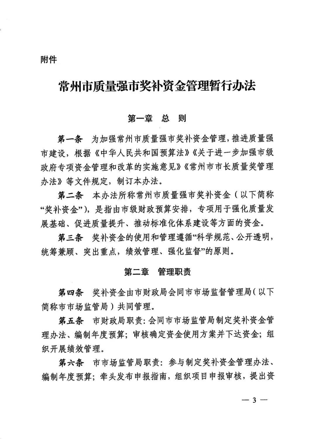 近日,常州市财政局 常州市市场监管局发布《常州市质量强市奖补资金管理暂行办法》。其中,首次获得”中国质量奖“或”中国质量奖提名奖“的组织(个人),分别按200万元、100万元奖励;首次获得”江苏省省长质量奖“或”江苏省省长质量奖提名奖“的组织,分别按100万元、50万元奖励。
