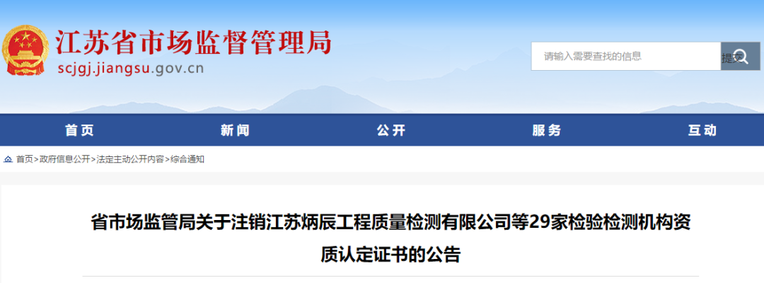 江苏省市场监管局关于注销江苏炳辰工程质量检测有限公司等29家检验检测机构资质认定证书的公告