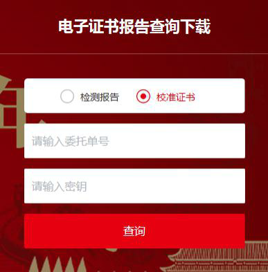 (2)点击证书查询,显示电子证书报告查询下载系统,选择校准证书下载,填写委托单号和密钥,如下图所示: