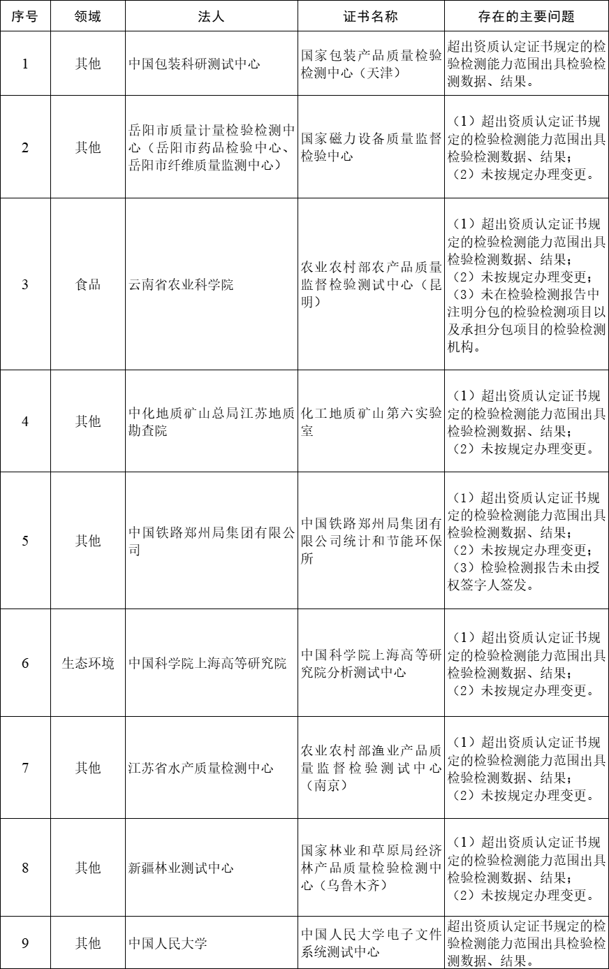 (二)责令存在超出资质认定证书规定的检验检测能力范围出具检验检测数据、结果等问题的9家机构限期改正,并移交属地市场监管部门实施行政罚款。
