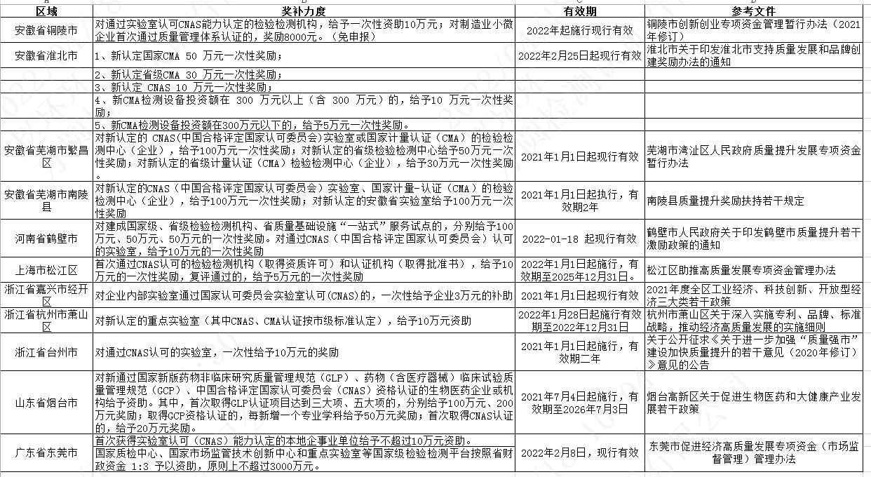 现对CNAS、CMA认证补贴相关奖励政策做了搜集整理,详情如下: