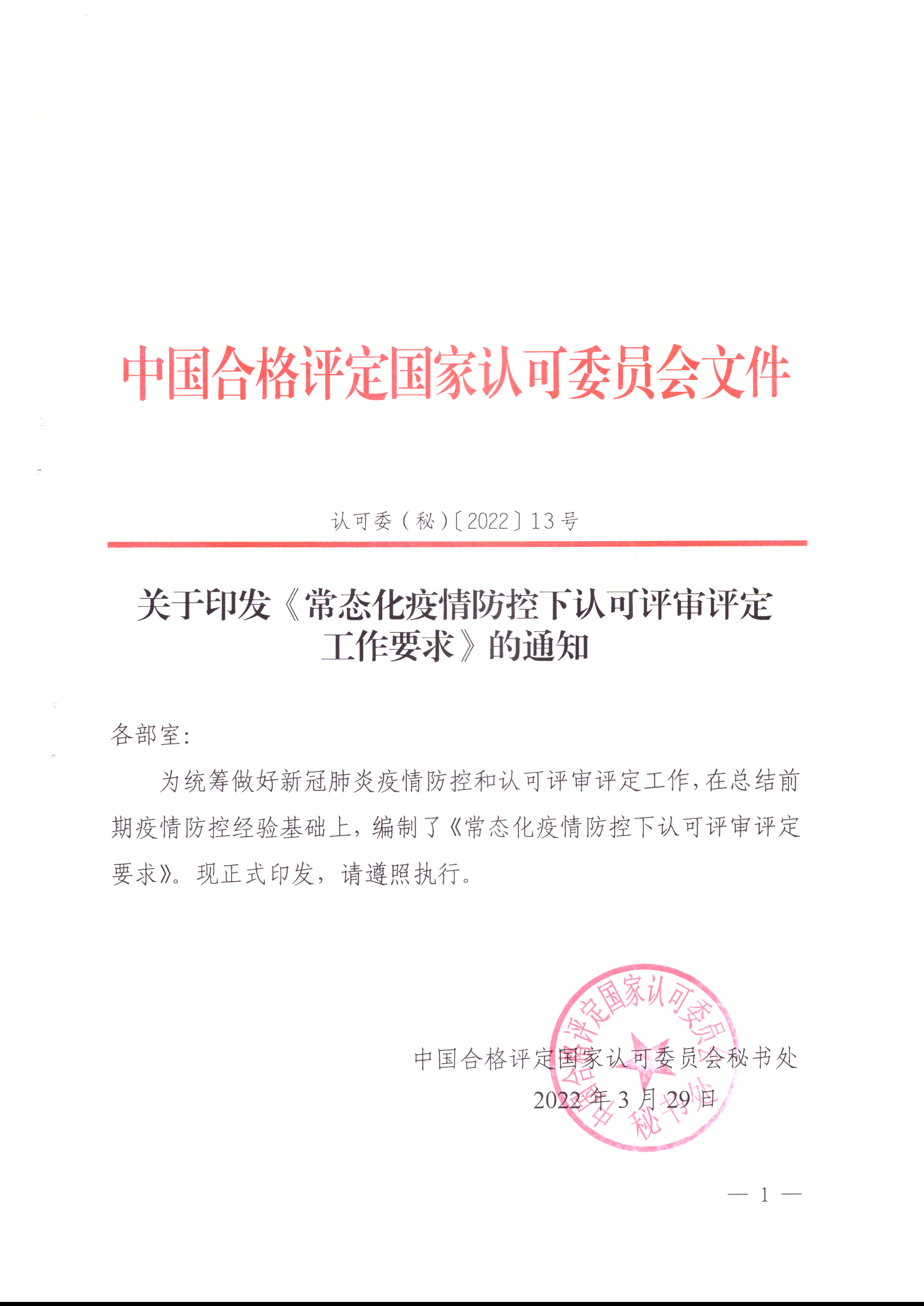 近日,中国合格评定国家认可委员会印发《常态化疫情防控下认可评审评定工作要求》,要求在落实各项疫情防控要求的前提下,做好认可评审评定派员工作。文件对认可评审评定派员总体要求、现场评审实施条件、现场评审实施安排、外派执行评审任务中遇到的问题及采取的应对措施、疫情期间外出评审发生额外费用报销规定做出了说明。具体内容如下: