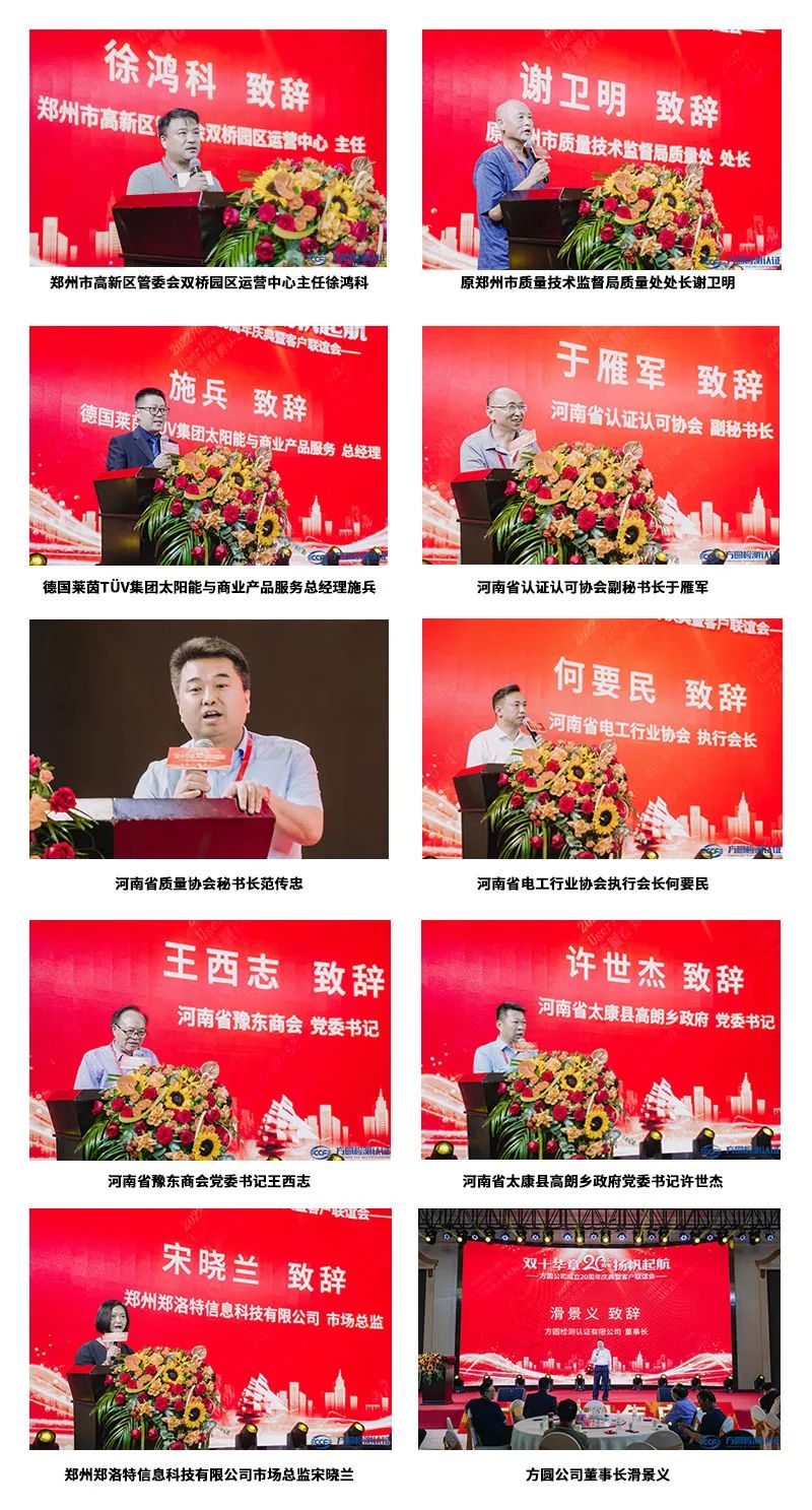 庆典伊始,郑州市高新区管委会双桥园区运营中心主任徐鸿科,原郑州市质量技术监督局质量处处长谢卫明,德国莱茵TÜV集团太阳能与商业产品服务总经理施兵,河南省认证认可协会副秘书长于雁军,河南省质量协会秘书长范传忠,河南省电工行业协会执行会长何要民,河南省豫东商会党委书记王西志,河南省太康县高朗乡政府党委书记许世杰,索凌电气有限公司总工程师薛冰,郑州郑洛特信息科技有限公司市场总监宋晓兰,金年会娱乐官网首页董事长滑景义分别致辞。