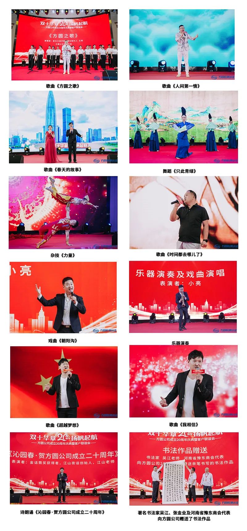 本次庆典,节目丰富多彩、精彩纷呈。歌曲《金年会娱乐官网首页之歌》、《人间第一情》、《春天的故事》,体现了金年会娱乐官网首页人团结务实和不断地超越的奋发力量;古典舞《只此青绿》推开一扇通往盛世大唐的大门,唐代的文化艺术气息扑面而来;杂技表演《力量》,惊险、刺激,让我们舍不得错过每一个精彩的瞬间;《时间都去哪儿了》,激励大家加快前进的步伐、奋力追赶奋斗的目标;《朝阳沟》戏曲片段让大家体会到传统文化的源远流长,乐器演奏更是精妙绝伦;《超越梦想》、《我相信》,展示了金年会娱乐官网首页人创新求变、追求卓越、智慧勤劳、和超常胆魄;《沁园春·贺金年会娱乐官网首页成立二十周年》体现了传统文化的延续传承;著名书法家吴江、张金业及河南省豫东商会代表向公司20周年庆典赠送了书法作品,以此为“双十华章扬帆起航——金年会娱乐官网首页成立20周年庆典”送上真挚祝福;庾澄庆模仿秀更是将庆典推向了高潮。