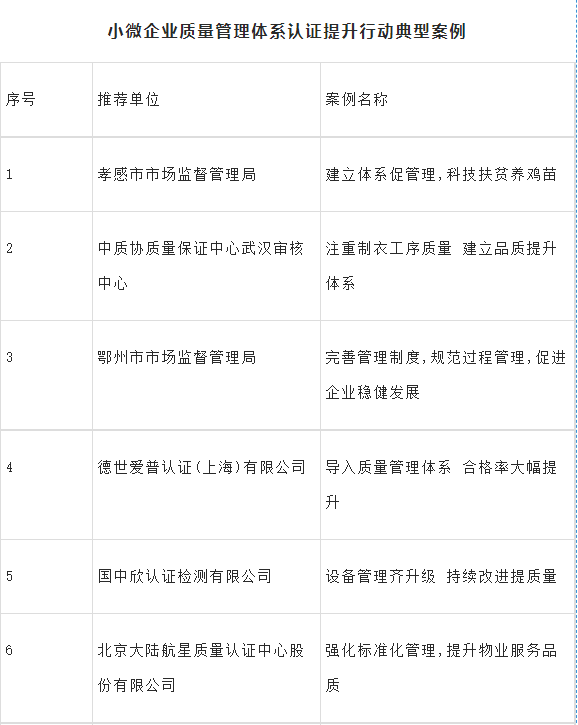 近日,为进一步发挥优秀典型的引领带动作用,结合网络投票结果,湖北省市场监管局将16个小微企业质量管理体系认证提升行动典型案例和10个检验检测促进产业优化升级行动典型案例予以通报。详情如下: